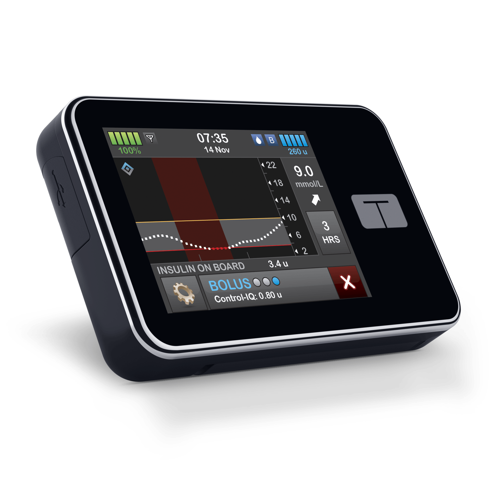 The t:slim X2 insulin pump with Control-IQ technology (the System) consists of the t:slim X2 insulin pump, which contains Control-IQ technology, and a compatible continuous glucose monitor (CGM, sold separately). The t:slim X2 insulin pump is intended for the subcutaneous delivery of insulin, at set and variable rates, for the management of diabetes mellitus in people requiring insulin. The t:slim X2 insulin pump can be used solely for continuous insulin delivery and as part of the System. When used with a compatible CGM, the System can be used to automatically increase, decrease, and suspend delivery of basal insulin based on CGM sensor readings and predicted glucose values. The System can also deliver correction boluses when the glucose value is predicted to exceed a predefined threshold. The pump and the System are indicated for use in individuals six years of age and greater. The pump and the System are intended for single user use. The pump and the System are indicated for use with NovoRapid or Humalog U-100 insulin. The System is intended for the management of Type 1 diabetes.